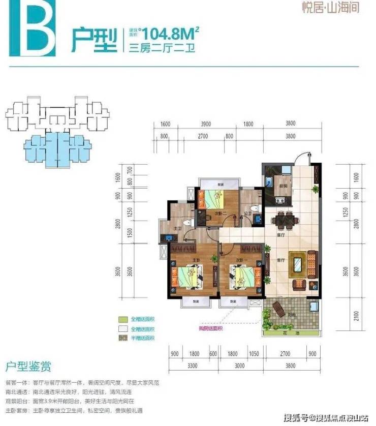 悦居·山海间在售户型面积约为101㎡~106㎡,包括三房两厅两卫和两房两厅一卫两种格局。户型方正,明厨明卫,动静分区合理,阔绰阳台设计,让居住空间更加宽敞明亮。其中,北朝向的三房两厅两卫户型全通透,采光极佳;南朝向的三房两厅两卫户型半通透,视野开阔。购房者可以根据自己的需求和喜好选择合适的户型。