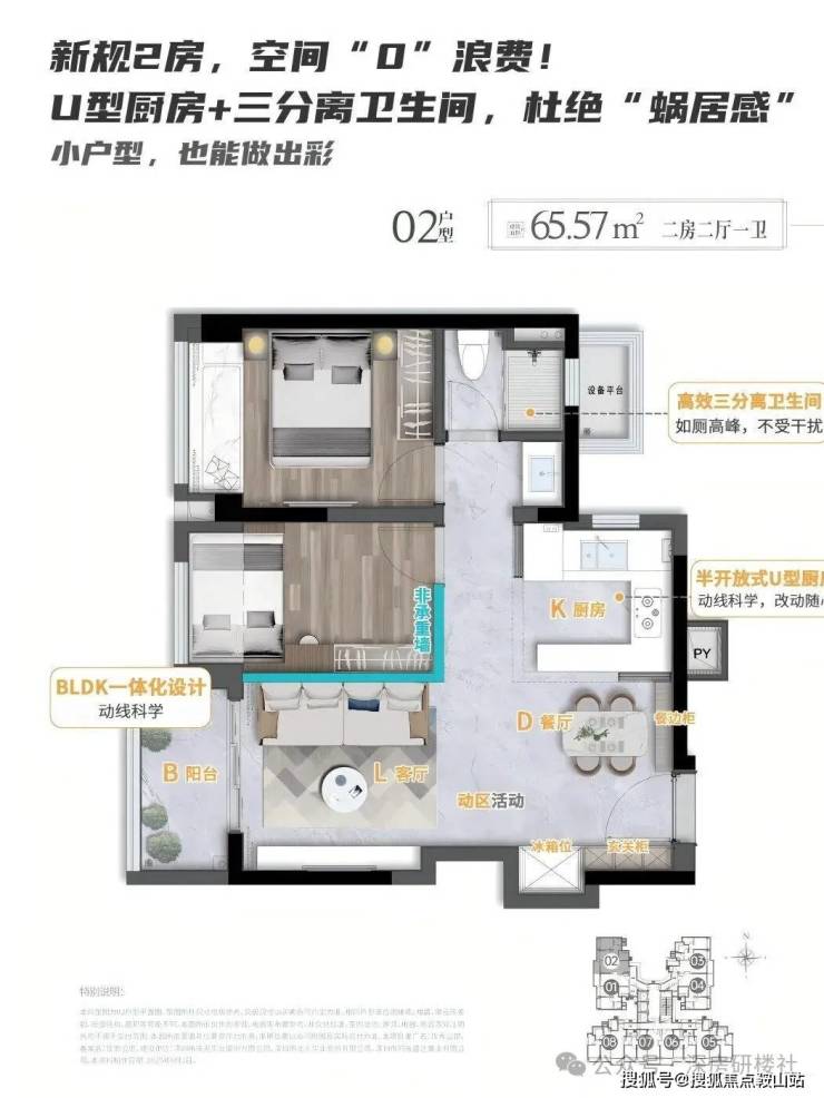 面积虽然不大,因为拥有大露台、大飘窗和设备平台,极大扩展了实用面积,非常适合年轻的三口之家。