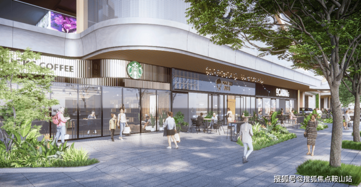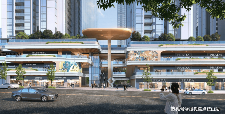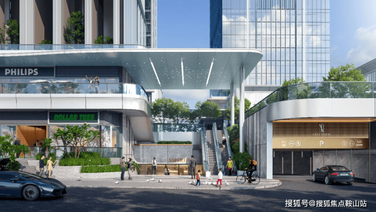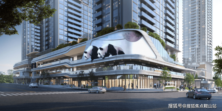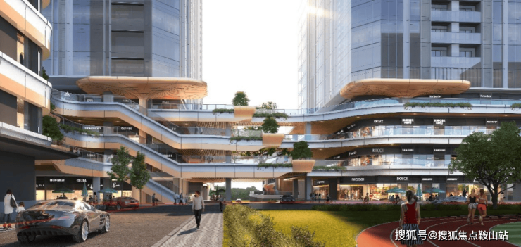“立体街”既多首层的设计理念,使商业界面不仅仅作为一个楼盘与城市的界面,更是一个强大的粘合剂,将楼盘与周边城市资源有机结合。设计引入了"开放"和"植入"两个理念。"开放"意味着商业不再仅仅是一个独立的场所,而是与开放空间、城市公共通道以及归家路径相结合的网络体系。鼓励并预留商业场所可以24小时运营,让城市生活永不落幕,辐射价值。“植入”则是在适合的位置,植入城市空间的亮点,包括空中退台、城市绿地公园、创意形象立面以及空间艺术节点等,让其有随着时间推移发展的可能性,不断给塘城带来新的面貌和活力。以弧形曲线打造充满音律动感与现代气息的立面形象,行走其中的人们亲身谱写生活的协奏曲,穿插的小金伞则为这一曲目增添令人惊喜的变奏,东立面的超级垂直幕布更是将曲目推向高潮。