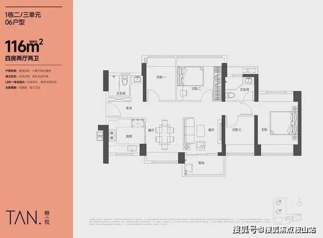 116㎡的4房2厅2卫,设计的是横厅南北通透格局,LKDB一体化设计,进门入户玄关,五开间朝南,超大宽面,主卧南北通设计,U型厨房,得房率:74.35%(不含赠送),阳台主朝东南向。