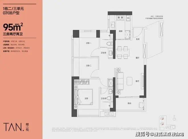 95㎡的3房2厅2卫,设计的是竖厅格局,LKDB一体化设计,进门入户玄关,有1个次卧做的双飘窗,U型厨房,卫生间三段式分离,得房率:74.34%(不含赠送),全部东南朝向。