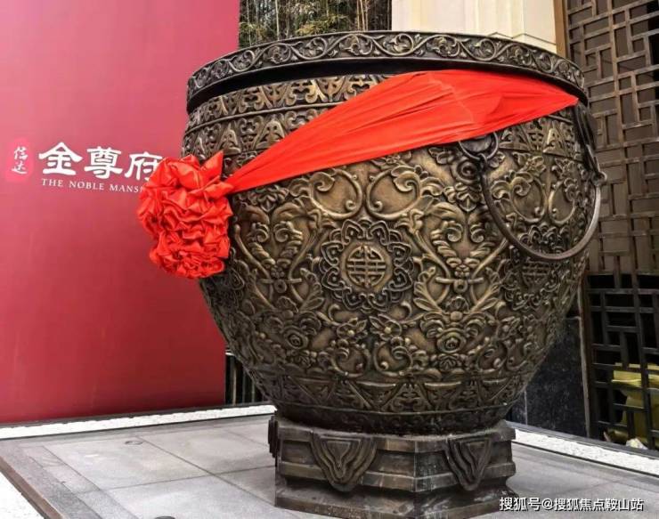 比如,小区大门口福地之上摆放的两尊聚宝盆,重达1.5吨,纯铜定制的镇宅之宝,刻画着五福捧寿图样,寓意上好。