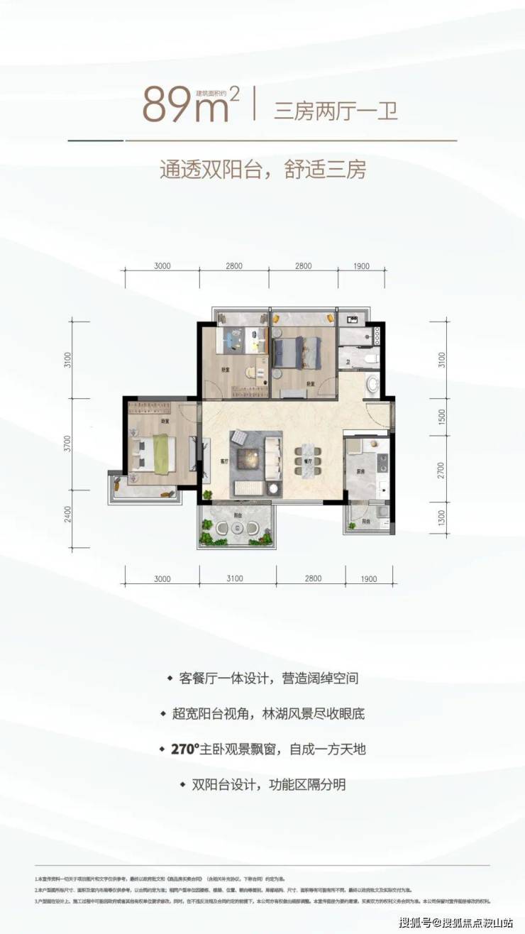 约89㎡三房两厅一卫:通透双阳台,三口之家的舒适三房