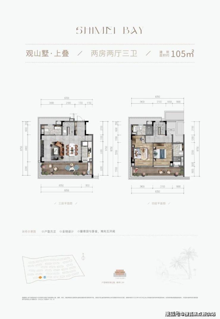 |建筑面积约105㎡○三卫设计,舒适起居,生活自在不拥挤○户型方正,全明设计,纵览山海风景○LDKB专享度假感格局,丰富生活层次○餐客厨与卧室,南向三开间,阳光满室○套房式主卧,约8.4m朗阔阳台,环瞰山海