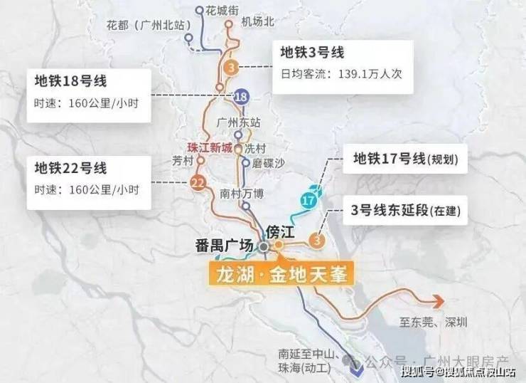 一站即达番禺广场站,里面有地铁3号线、18号线、22号线、3号线东延段 、17号线(规划中)五轨交汇,一站畅行琶洲,两站通勤珠江新城