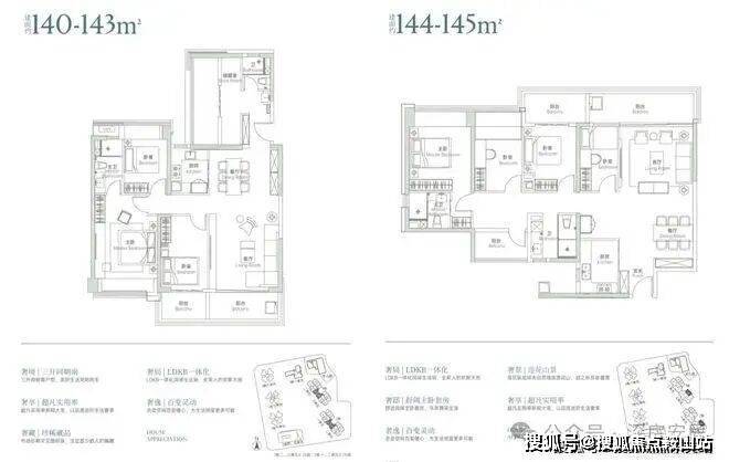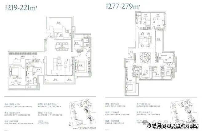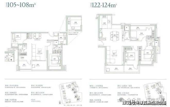 105-108㎡双龙抱珠3房2卫,122-124㎡通透4房2卫(可改3卫),123-129㎡竖厅4房2卫(可改3卫),140-144㎡竖厅4房2卫(可改3卫),144-145㎡竖厅5房2卫(可改3卫),188-190㎡4房3卫,219-221㎡和227-279㎡大平层户型。