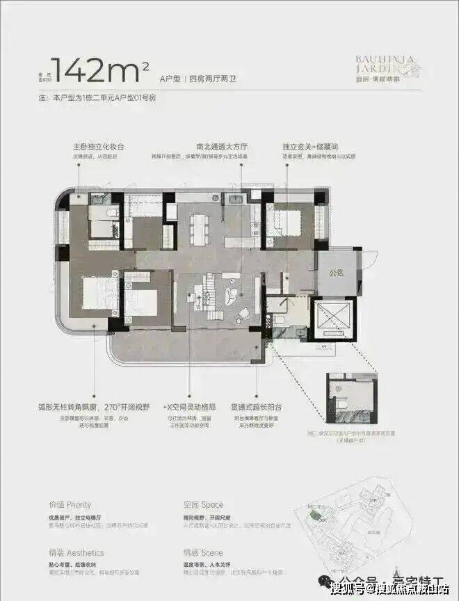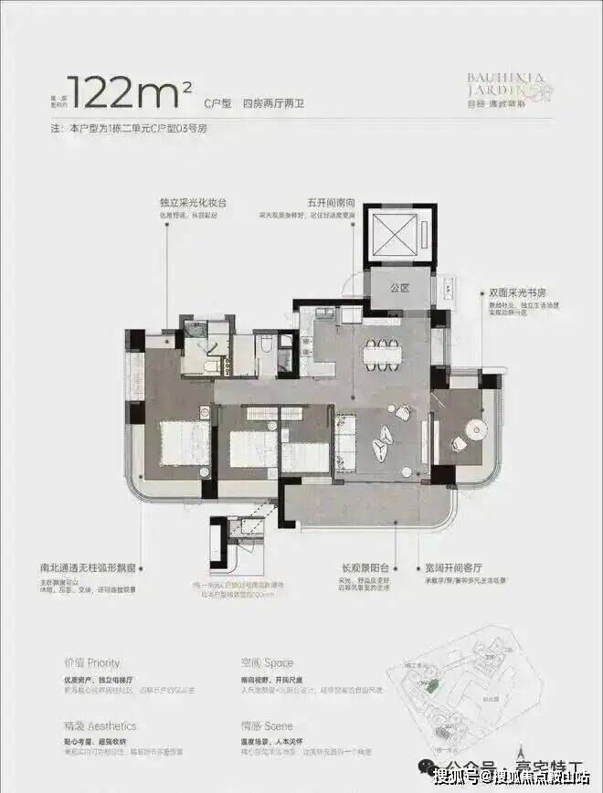 双龙抱珠户型,整个户型非常通透。书房分布于客厅另一侧,难得的双面采光+270°景观视野。主卧南北通透,景观面开阔。