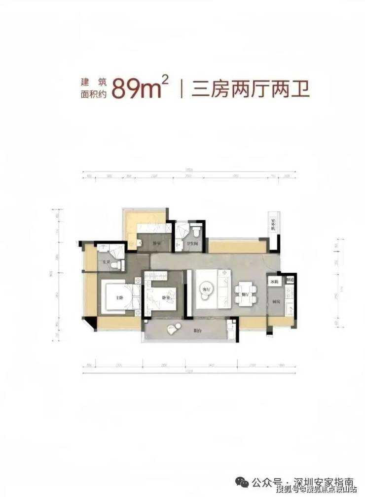 89㎡的3房2厅2卫,1栋04户型,设计的是横厅南北通透格局,客餐厅5.4米开间,LDKB一体化设计,分别做到了主卧16.02㎡/次卧9.07m²/次卧8.26㎡(包含墙体飘窗),客厅连接次卧出9.3m²的巨幕大阳台,L型厨房,卫生间干湿分离,得房率约79.6%(不含赠送),阳台主朝西南向。套内面积70.43m²+赠送面积21.17m²=实用面积91.6m²,加上赠送面积后得房率103.55%。