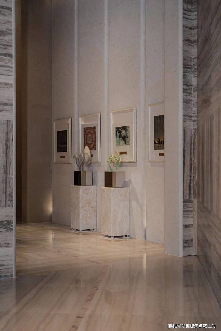 (艺术走廊两侧是竖向石材立柱,搭配线性灯光,将视线自然引向电梯入口)