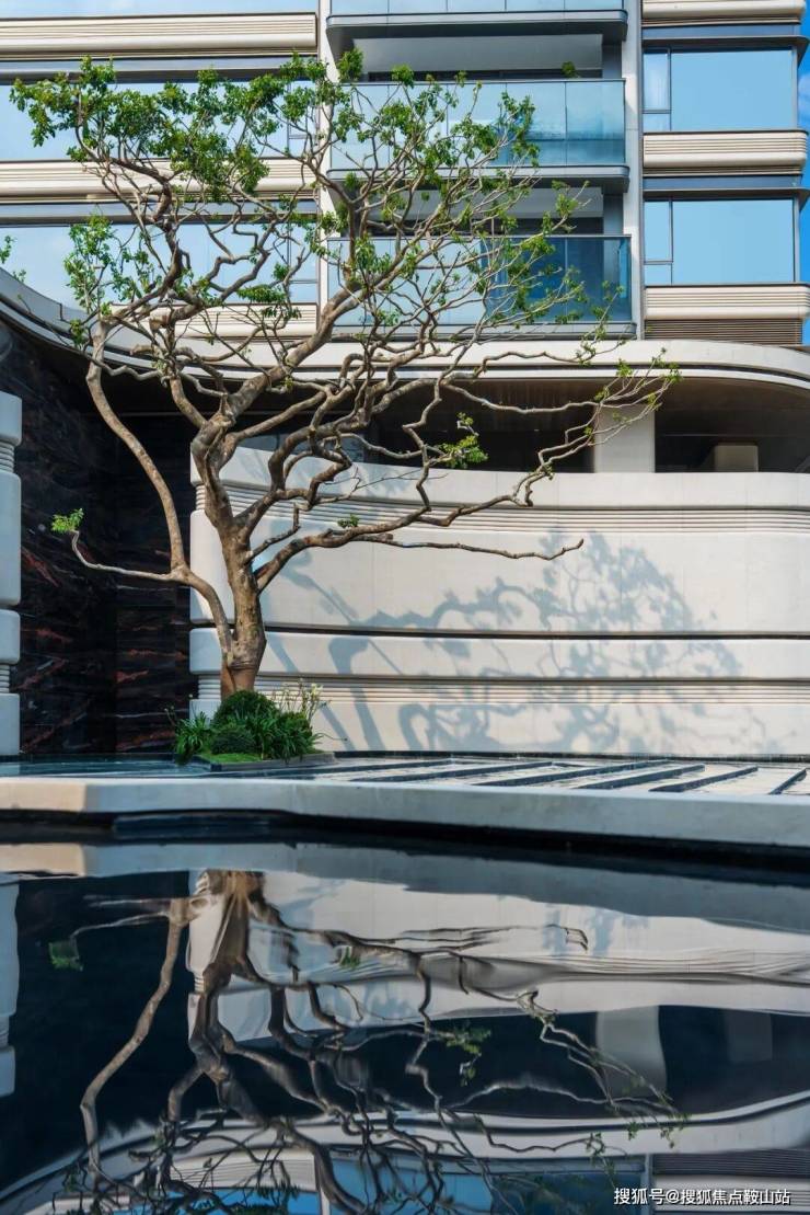 树龄近百年的铁冬青搭配海浪灰花岗石水景,是典雅、自然气质的表达,弥漫在招商海晏府的每一个角落。
