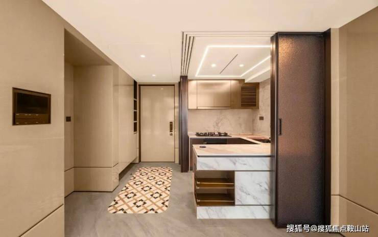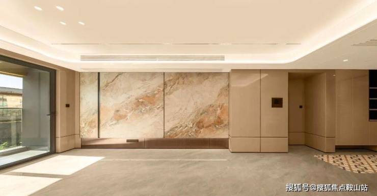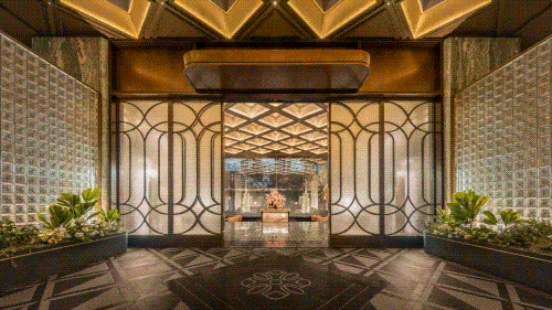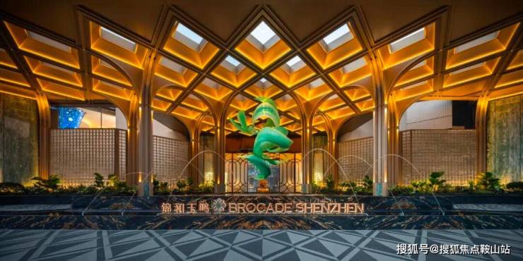 首先引入眼帘的归家门庭,这里打造了近51米长的恢弘门头,也是深圳首个旗舰门头,20根约7米高的巨大香槟金色立柱若玉树生长,再搭配上《锦阙盈门》雕塑、宝相花纹超级符号......奢华的基调,从归家的第一眼,便已全面展开。