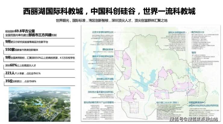 ②西丽湖国际科教城——创新驱动,构建“一心、两轴、三区、六大创新组团”的功能布局结构。汇聚深圳大学、南方科技大学、清华大学深圳研究生院、北京大学深圳研究生院、哈工大深圳研究生院等7所高校,超1100家的国家高新技术企业。