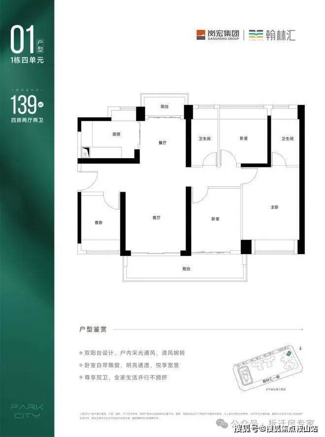 竖厅南北通透格局,入户设岗宏翰林汇售楼处电话:☎400-892-2273有玄关,LDKB一体化设计。双阳台配置,四个开间朝南,客厅与次卧相连的超大阳台,U型厨房,卫生间干湿分离。得房率约71%(不含赠送部分),主要阳台朝东南向。