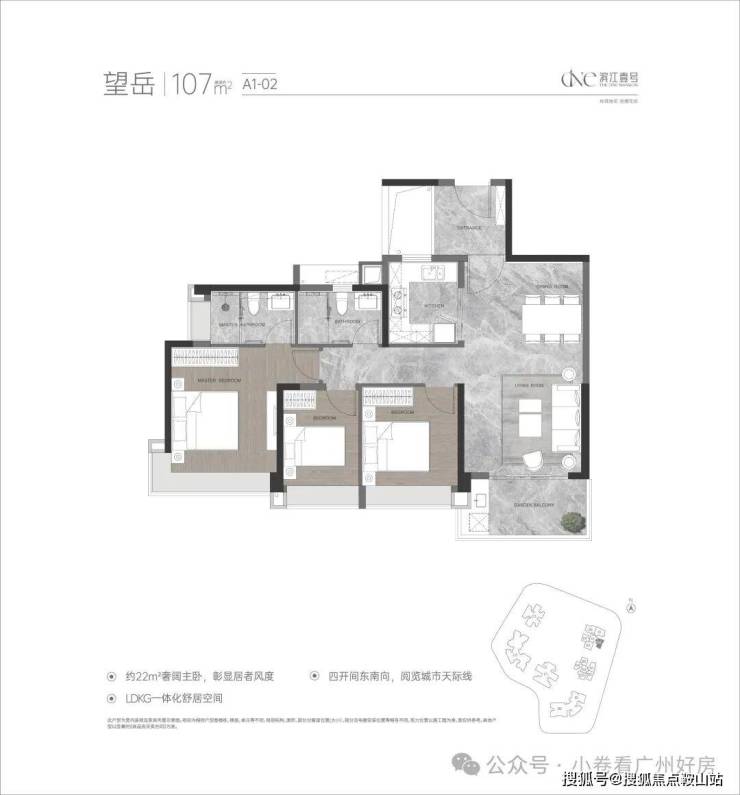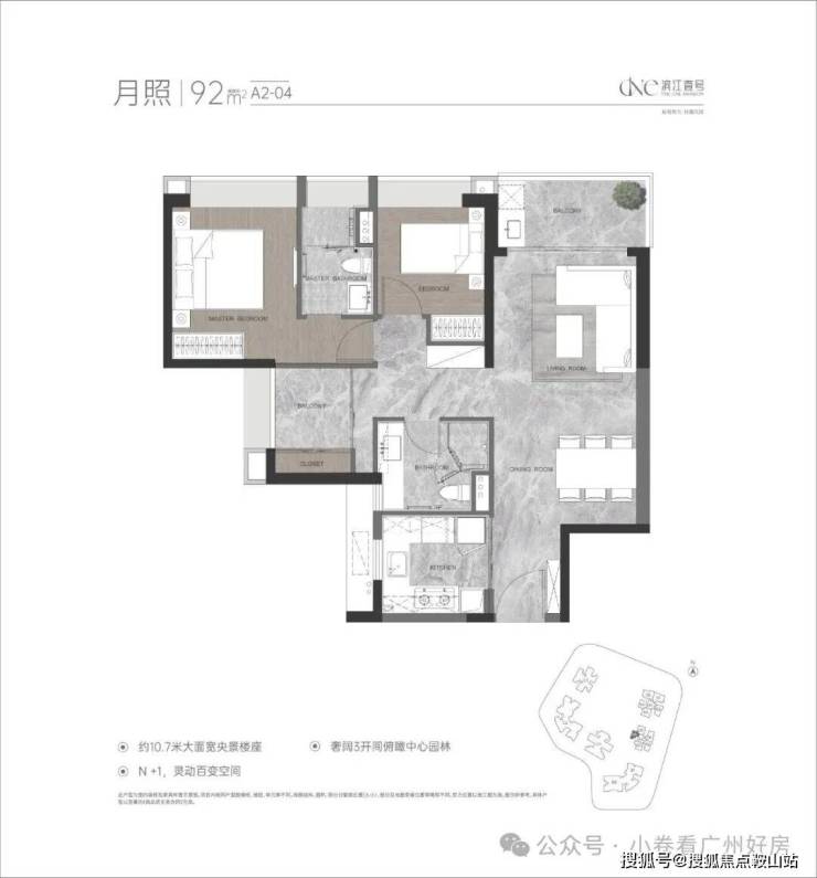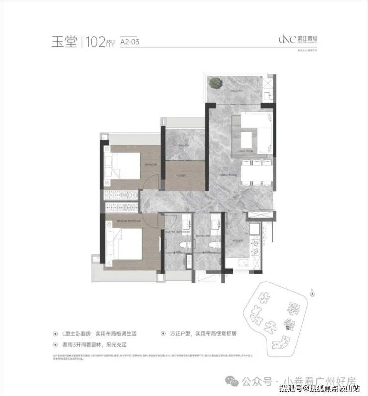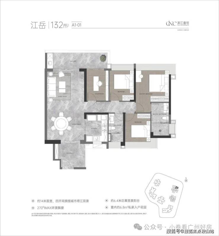 小区高层可南向直面珠江,内部有1.5万㎡景观面积,社区6000㎡的中心园林,涵盖了1个中心景观沙龙、2个下沉式庭院绿谷以及8大全龄主题园区等。