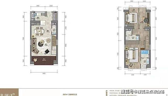 ★88㎡复式两房两厅三卫 双向通透采光,5.4米开间客厅及主卧,双套房周全设计,室内多变空间可根据家庭需要设置独特的功能。