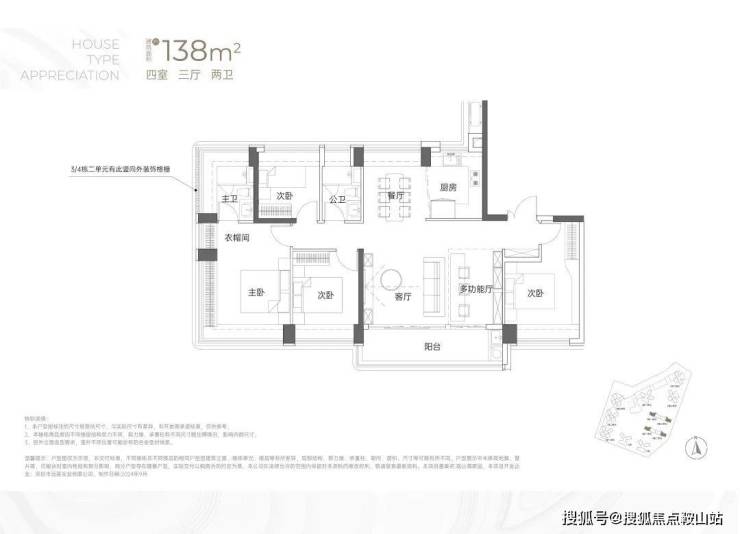 竖庭格局,西南向,基本居住功能与建面约108-110㎡4房2卫一致,但格局不一样,从目前公布的户型图上看,主要是主卧空间有了更大的提升,比如可以放更大一点的衣柜。但从位置上看,它所在的楼栋更靠近主干道,会有噪音影响。