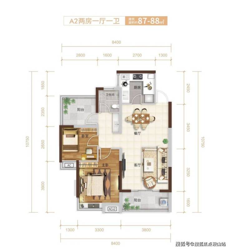 A2户型:87-88㎡2+1房2厅1卫