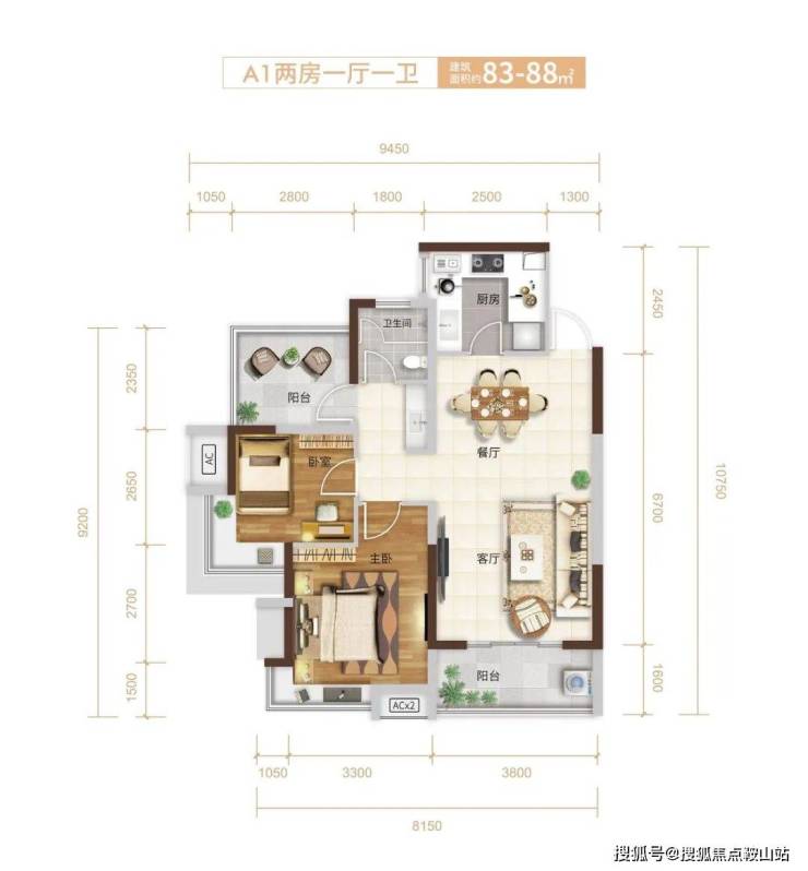 A1户型:83-88㎡2+1房2厅1卫