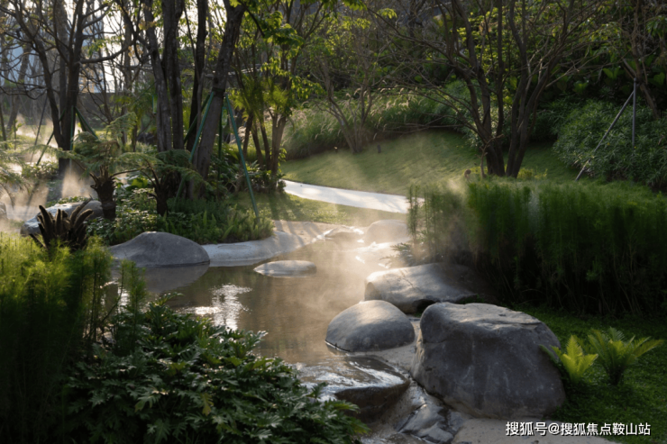 狭长的雨林戏水区融合生态、亲子、戏水等功能,呈现出浓郁的丛林感溪谷玩乐空间。儿童戏水的溪谷沿岸是自然置石,岸边散铺鹅卵石,池底嵌入自然片石,以最自然的方式处理了高差,也给孩子们带来最本真的欢乐。