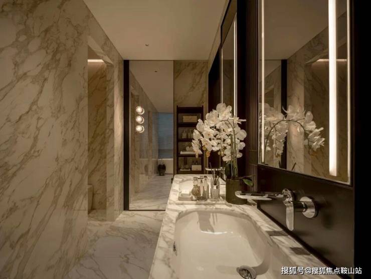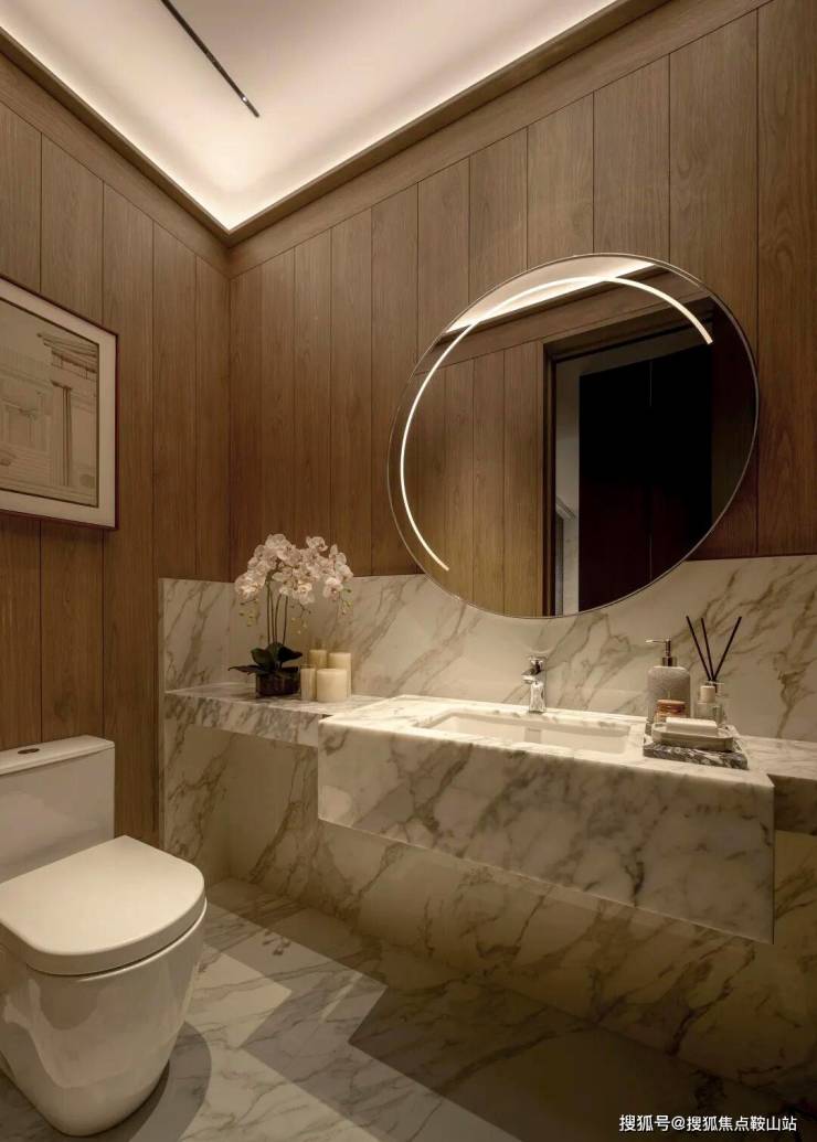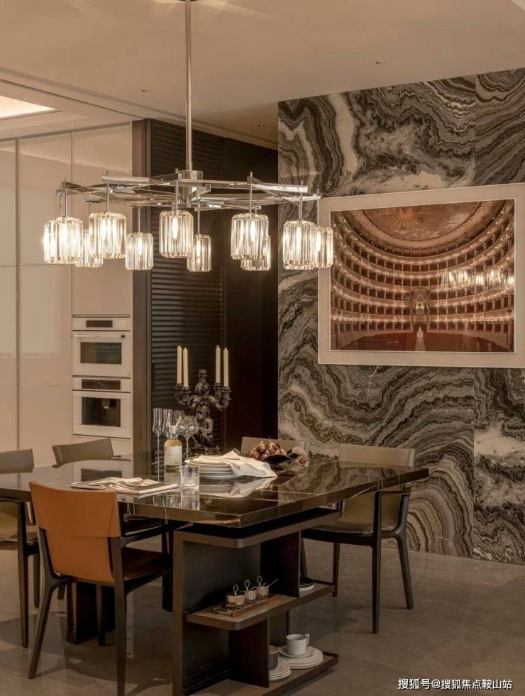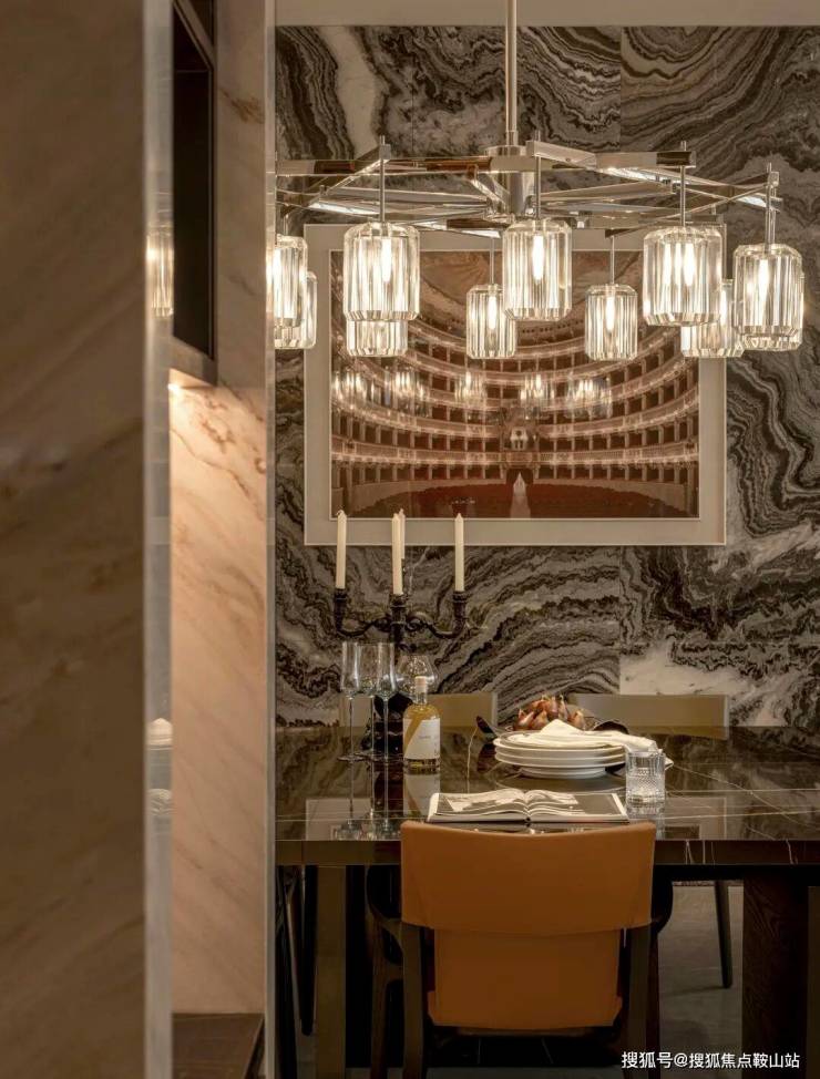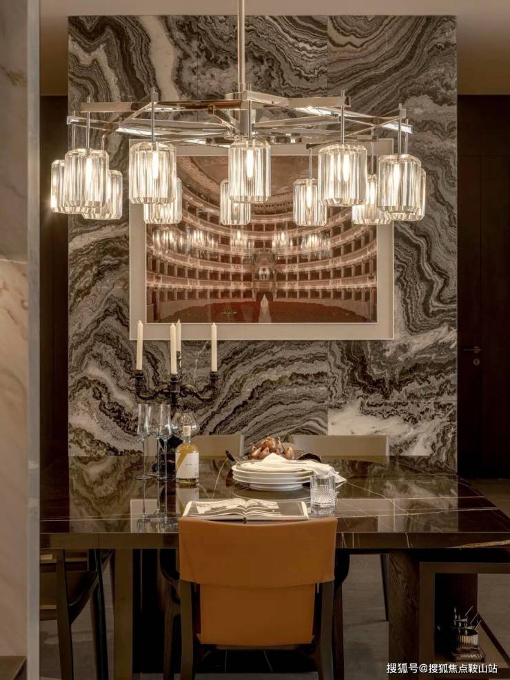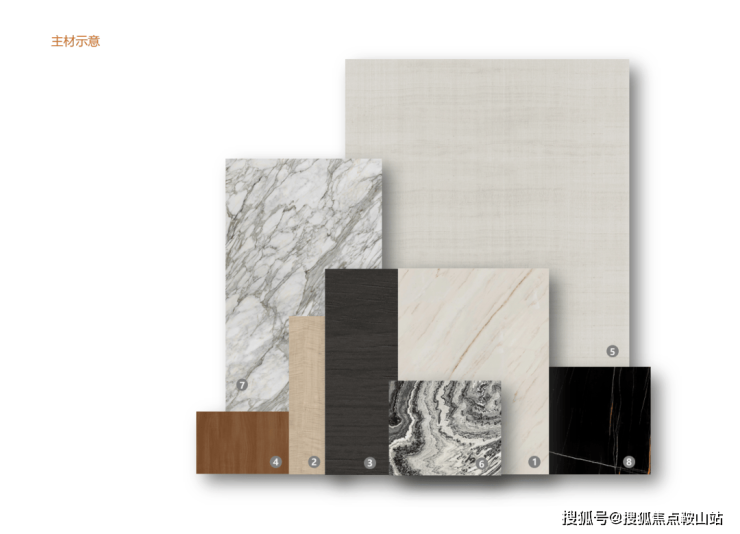 ▽主材,黑白灰搭配暖棕色+天然石材的绝美纹理。