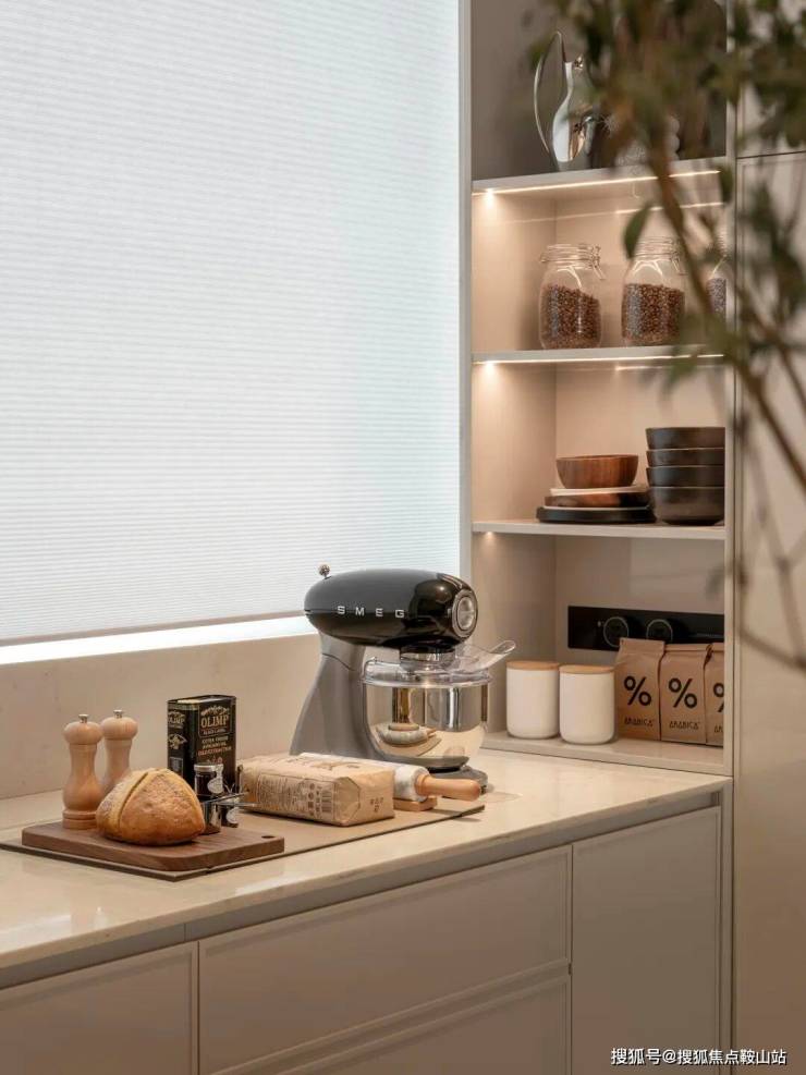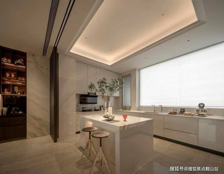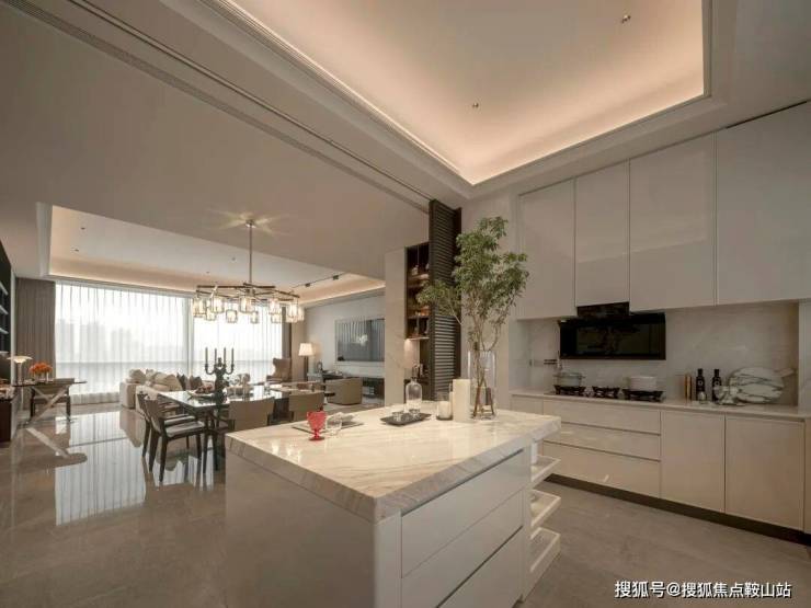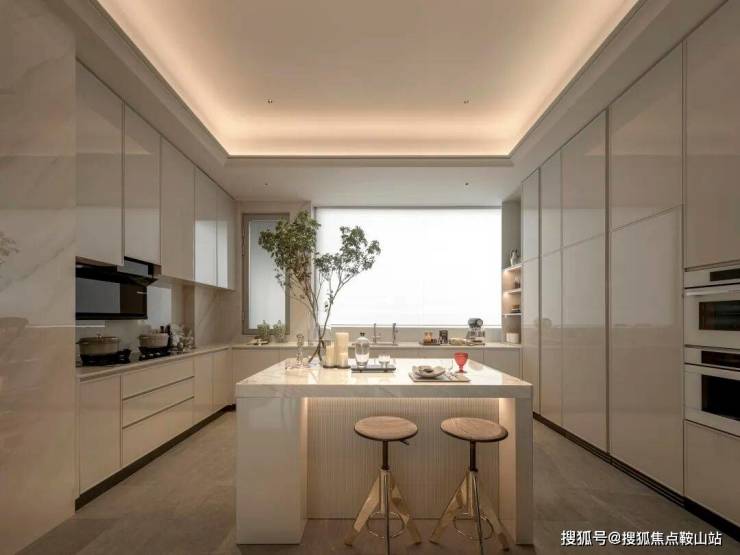 纯白色开放式厨房,隐藏移门于两侧的墙面,开合随心。