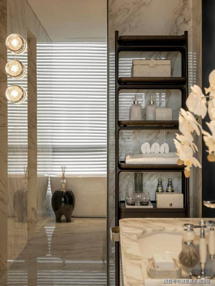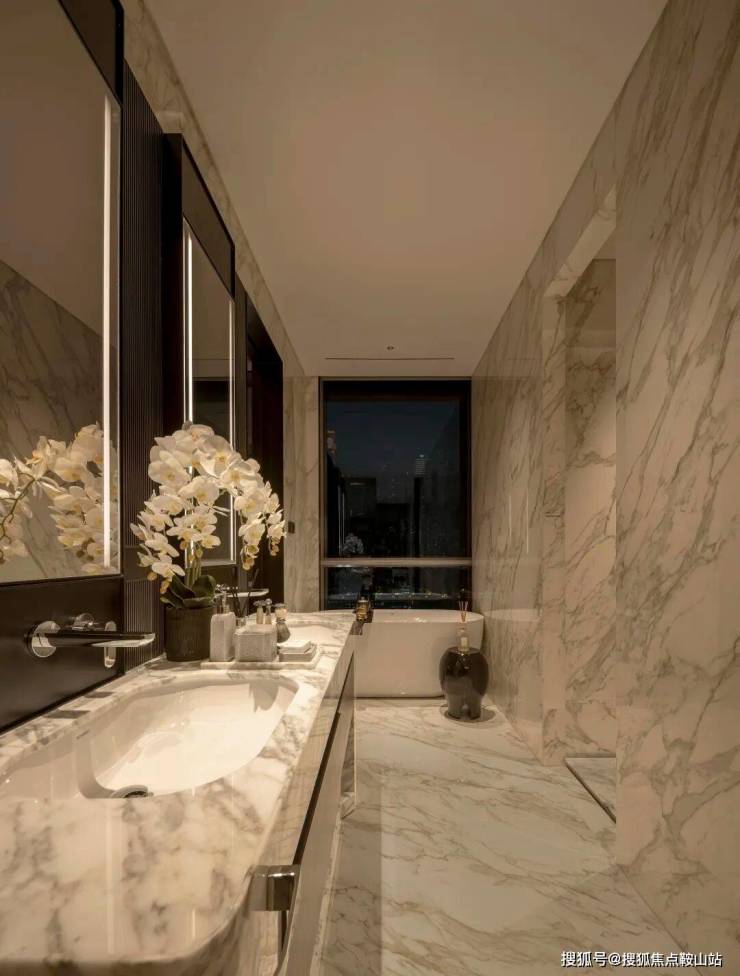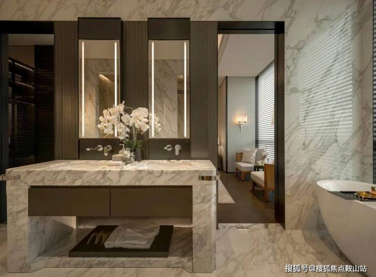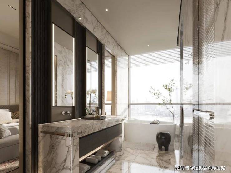 主卫拥有双台盆和窗边独立浴缸。这里是最私密也最放松的空间。