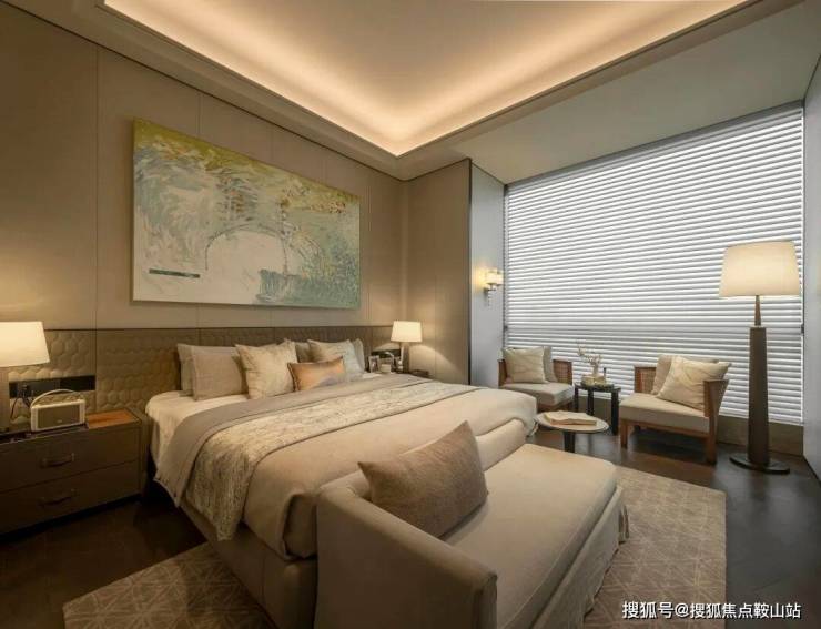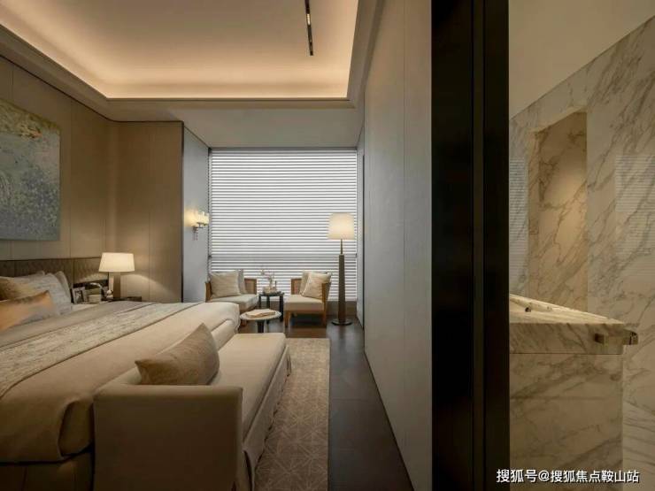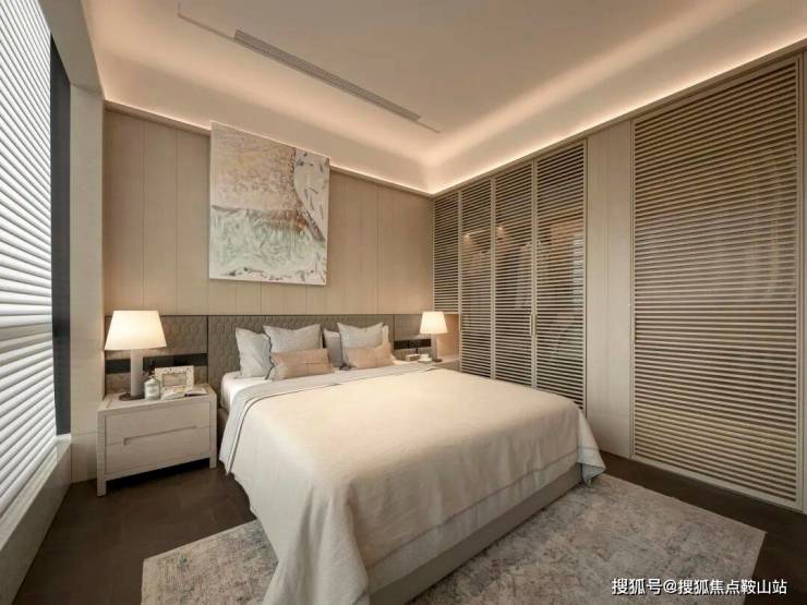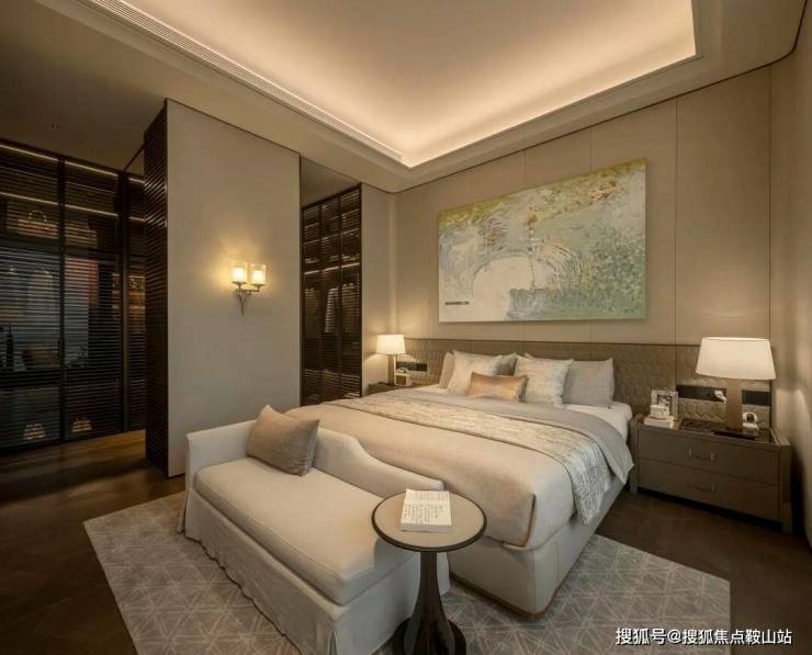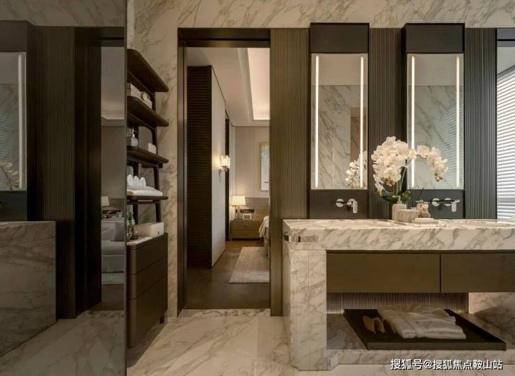主卧套间布局采用了度假酒店类似的格局,自带可开合衣帽间和mini bar,更为双台盆四件套浴室和2面墙的衣柜收纳留足了宽敞的空间。尺度舒适堪称奢侈。