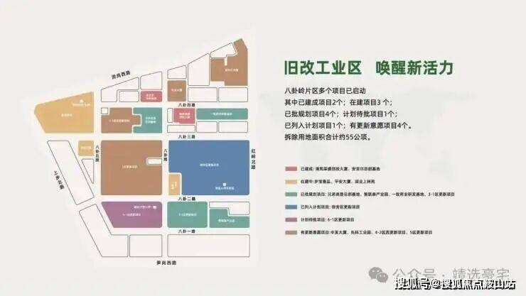 八卦岭片区多个项目已启动,其中已建成项目2个,在建项目3个,已批规划项目4个,列入计划项目1个,计划待批项目1个,有更新意愿项目4个。拆除用地面积合计约55公顷。