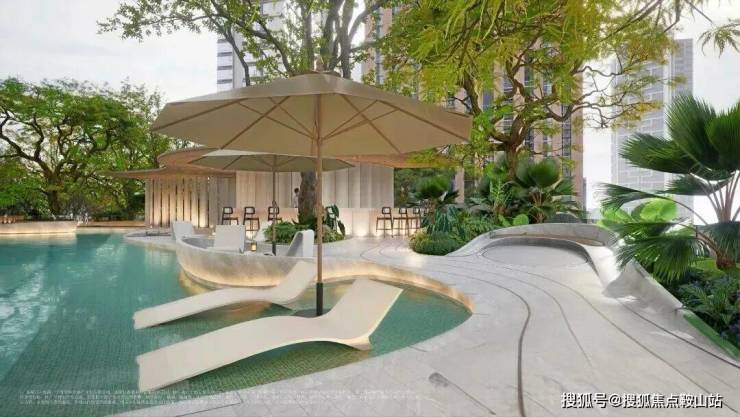 在重直的山林溪谷间,匠造一方悬浮林下的度假泳池,环水设有观景吧台,岸边日光躺椅,艺术沙发等多重复合体验,营造城市中心难得的森境疗愈度假感。