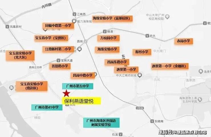 项目1公里范围内还有9所名校环绕:工业大道中小学、广州市第41中学、广州市第5中学、广州昌岗中路小学(翠城校区)、广州市海珠外国语实验中学附属学校、红棉小学(顺意小区)、海富小学、南燕小学、宝玉直小学(南边路校区)等名校。