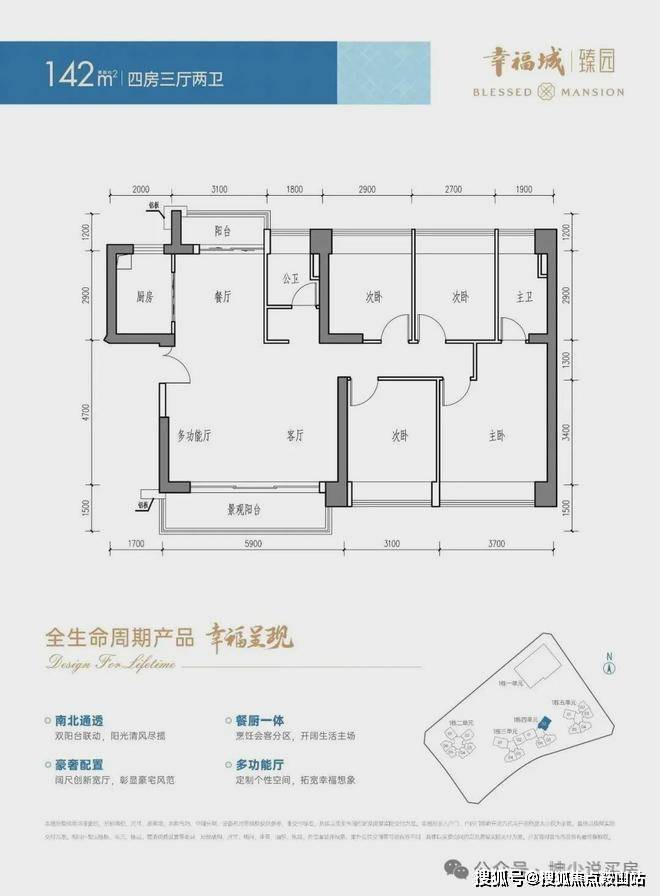 142㎡的4房3厅2卫,设计的是横厅南北通透格局,进门入户玄关,客厅5.9米开间,餐厨一体化设计,南北双阳台,全屋6个飘窗面,4个卧室分别做到了主卧18.31㎡/次卧12.4㎡/次卧10.15㎡/次卧9.45㎡(包含墙体飘窗),客厅出5.9米长的观景大阳台,U型厨房,公卫三段式分离,得房率约87.1%(包含赠送),阳台主朝东南向。