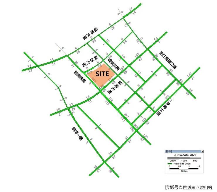 设计以项目红线外2km的整体场域进行交通出行的计算考量,根据交通需求的流量分布特征,采用SUE(Stochastic User Equilibrium)随机用户均衡模型分配至城市路网。最终将项目的总建筑面积、总户数、预测人流数据,通过“出行方式分担率”和“高峰小时机动化出行量”分配给不同出入口的通行能力和设计饱和度,是目前市场上最先进的社区交通分析测算方法的实际应用。