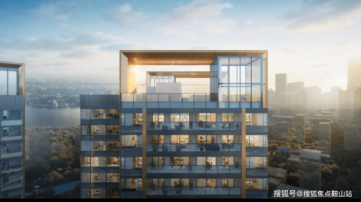 80米组团的两栋建筑紧邻前湾公园,立面以浅暖色调为主,凸显轻盈飘逸的滨水性格。香槟色铝板搭配三面采光的大面宽玻璃,将景色尽收眼底。错落的屋面花园呼应滨水空间的灵动自然。100米组团高层建筑,以暖褐色为主色调,呼应哈罗公学一侧场所气质。强调竖向的挺拔感及精致变化的横向层线,远看层次分明,近观细节丰富。塔冠是山墙面的自然延伸至顶部的立体构成,点缀简洁通透的屋顶观景空间。