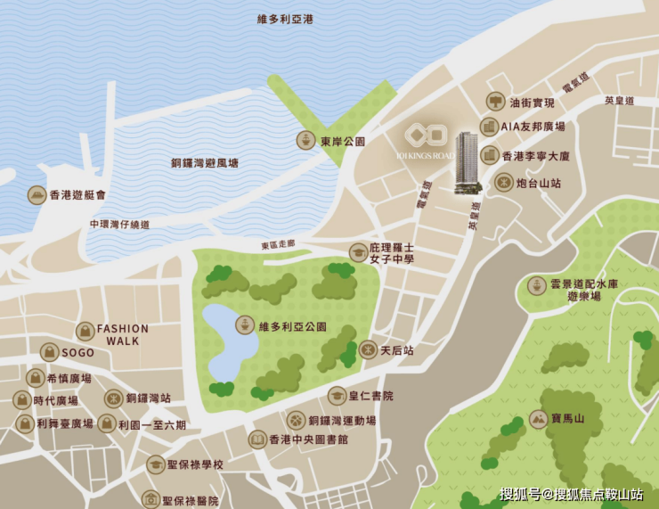 【周边配套】:楼盘设有约5,814平方呎(约646㎡)的商业楼面,而屋苑附近有国都广场、maxiMall等购物商场。此外,于电气道、歌顿道及水星街交界餐饮林立,步行至铜锣湾街市或电气道市政大厦街市分别需约10分钟;同时区内民生商店、邮局、银行等设施一应俱全。