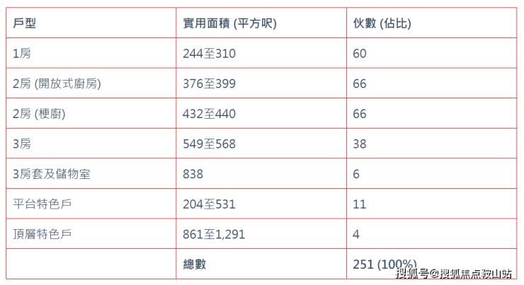 【户型】:项目共提供251伙单位,户型涵盖了一至三房以及特色户型,实用面积介于244至838平方呎(约27㎡~93㎡)。其中一房标准单位实用面积为244至310平方呎、二房标准单位实用面积介于376至440平方呎、三房标准单位实用面积介于549至568平方呎、特色单位实用面积介于204至1291平方呎。