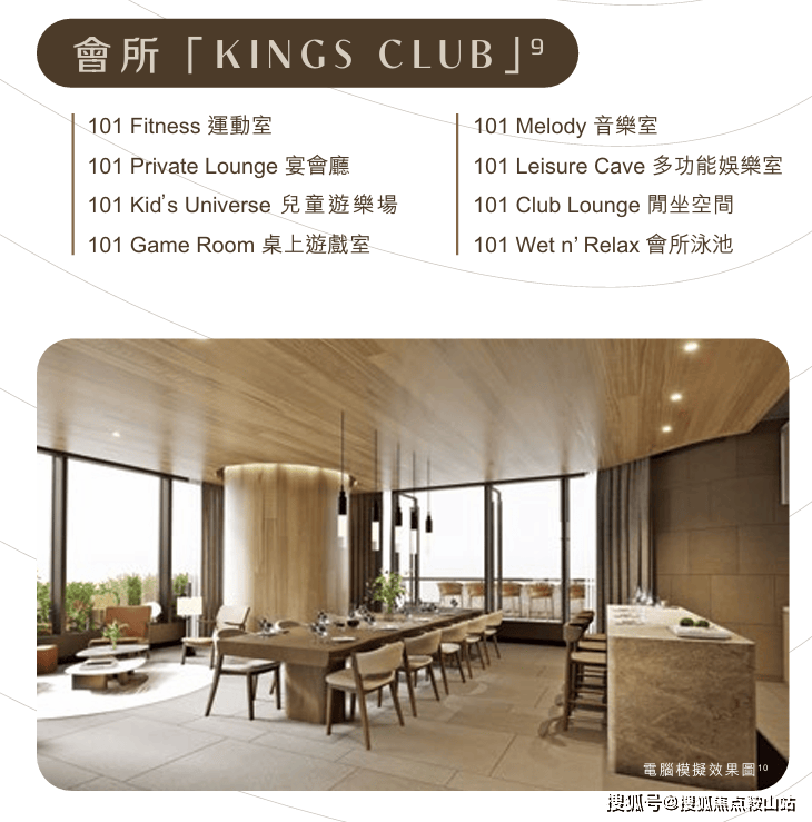 【配套设施方面】:项目于2楼设有会所“KINGS CLUB”,可用面积约 6,000平方呎(约666㎡),提供多样化的娱乐休闲设施,包括户外游泳池、运动室、宴会厅、多功能娱乐室、儿童游乐场、桌上游戏室等。