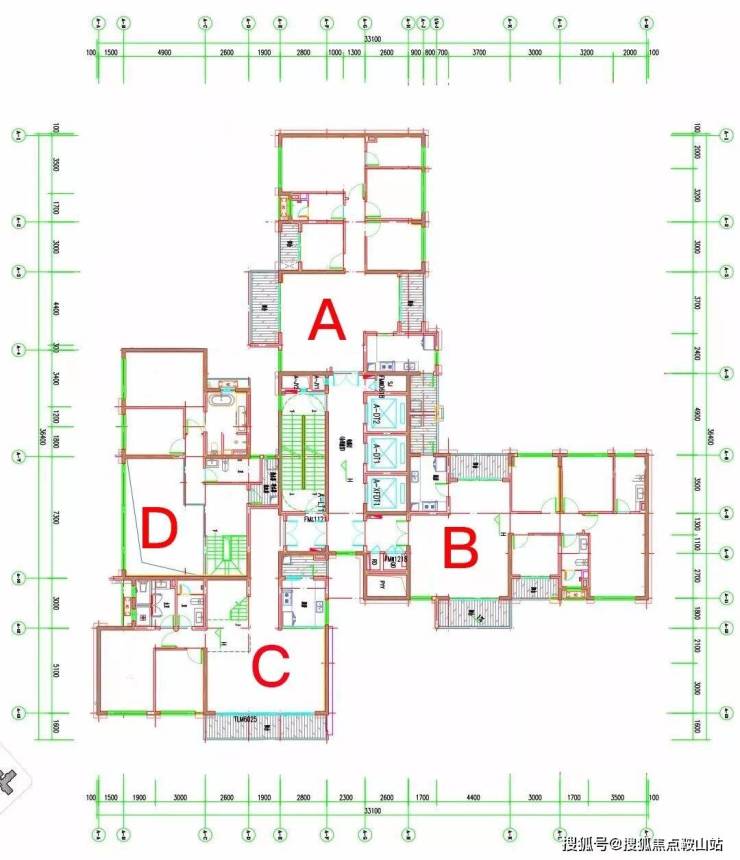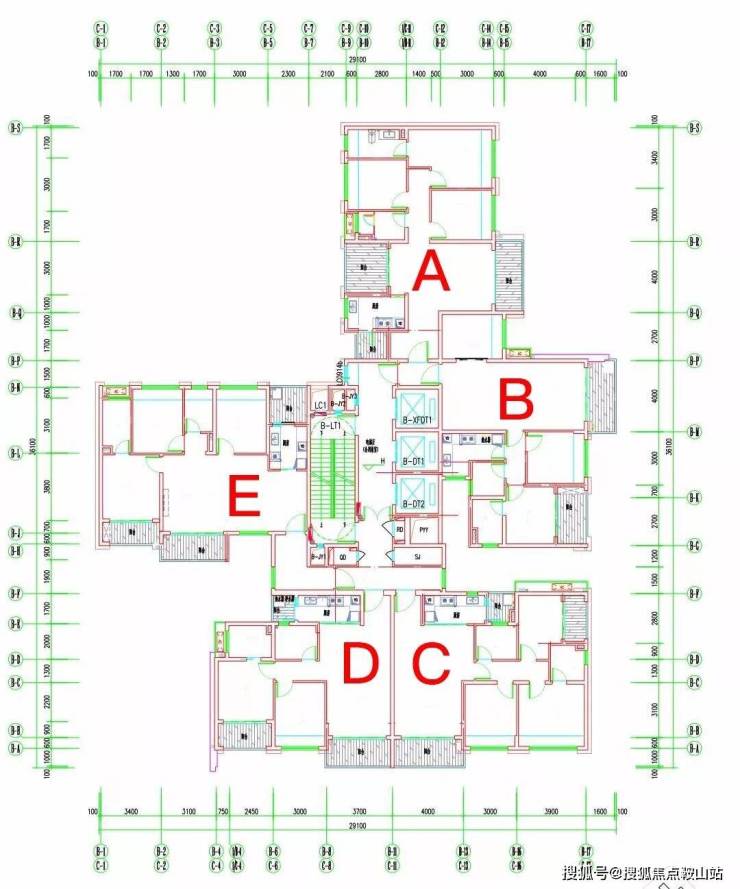 项目三栋住宅均为塔楼设计,A座三梯四户,B座、C座均为三梯五户,各栋户型分布平面图如下: