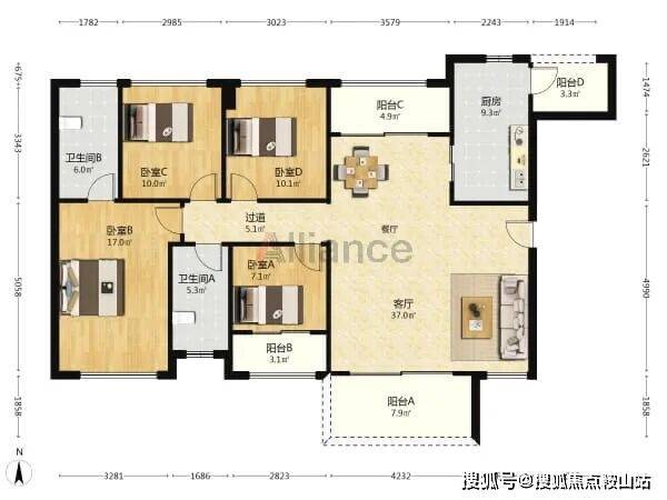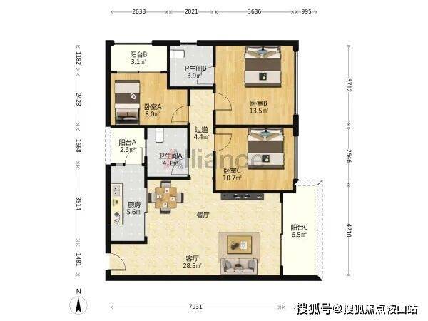 B/C座 A户型:约119㎡3房2厅2卫