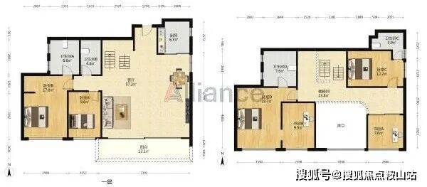 以上两种复式户型格局大体相似,具体面积有些许不同,为东南和西南朝向,4个卫生间配置也算比较奢侈的了。客厅开间达7.3米,出进深1.6米的阳台,视野开拓感还是比较好的。