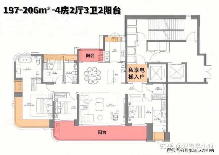 197-206m²的4房2厅3卫2阳台,设计的是竖厅格局,客厅6.1米开间,LDKB大方厅设计,2梯2户,尊享专梯专户,私享入户公区,进门配置储物间,五开间朝南,主卧270°无柱转角飘窗,双套房设计,中西双厨房,主卫配置浴缸,得房率约94.6%(包含赠送),不含电梯入户,南北双阳台,小阳台看大运公园山景,客厅连接2个次卧出超大观景大阳台,东南朝向,俯瞰整个大运中心。