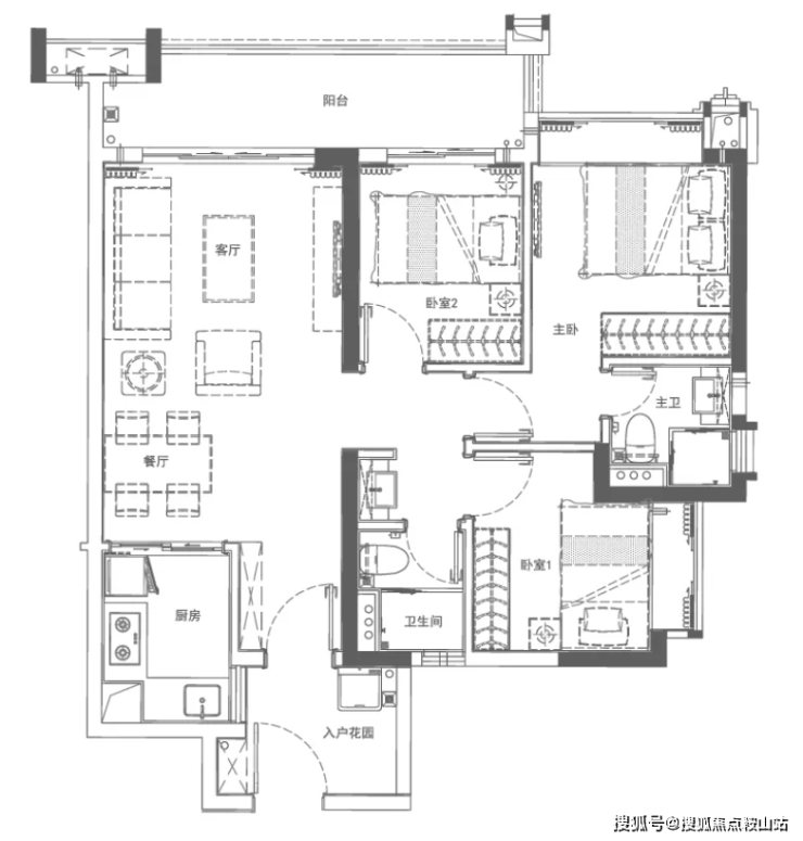 86㎡3房1卫,南北对流,餐客厅阳台一体化,实用率高,户型方正通透,采光通风一流。