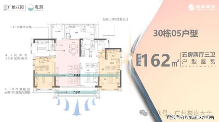 162㎡5房3卫,南北对流,四开间朝南,奢华湖景五房,7.3米超宽阳台,180°全方位望湖。