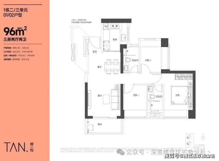 同样采用了竖厅布局,入户玄关宽敞明亮,客厅开间为3.55米,LKDB一体化设计确保了空间的高效利用,动静分区明确,一个次卧配备双飘窗,U型厨房操作便捷,卫生间三段式分离,得房率同样为74.34%(不含赠送),东南朝向确保了充足的阳光。