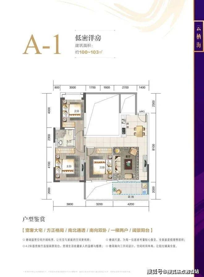 一梯两户,南北通透,阳光清风入户无拘束;双卧室朝南设计,4.2米面宽客厅连接阔景阳台,三面阳光环绕,生活乐趣自由延伸。