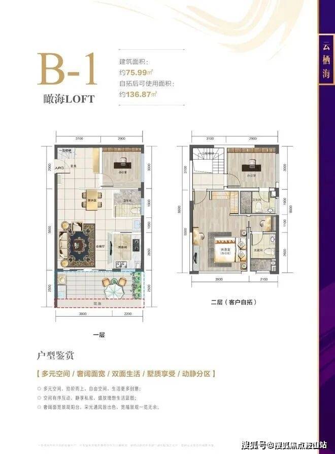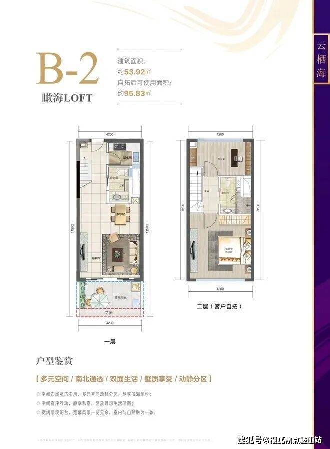 一层繁花,一层繁华;一层价格,两层空间享受。阔绰层高筑就活性多面空间,生活随心所欲;悦享4.2米宽阔景观阳台,室内与自然融为一体,尽享滨海生活美学。