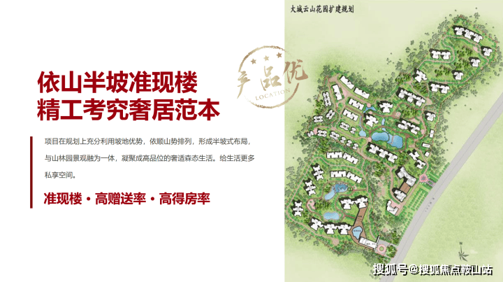 大城云山整个社区呈葫芦状,三面环山聚宝盆格局,置身于超4000亩北回归线森林公园里,植物资源极为丰富,公园内所有测点负离子浓度都在1500个/㎡以上,公园内空气清洁度达到最清洁的A级,典型的低密度住宅,整个建筑依山而建,顺山而居,形成融于自然山水的生活社区——真正公园里的家