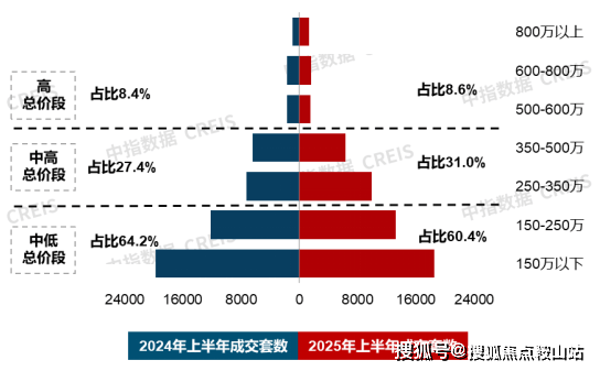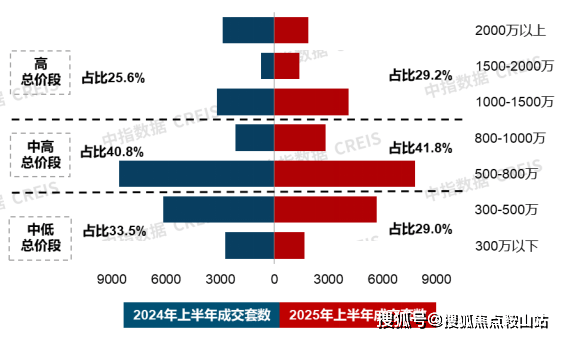 从成交总价结构看,500万以下产品成交套数占比29.0%,较2024年同期下降4.6个百分点。500-1000万总价段产品成交套数占比提升至41.8%。1000万以上产品成交套数占比29.2%,较2024年同期提升3.6个百分点。