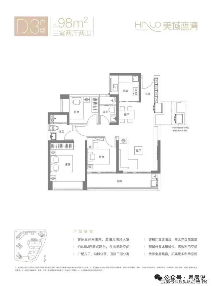 98㎡的3房2厅2卫,D3户型,经典竖厅格局,客厅3.7米开间,LDKB一体化设计,S墙设计预留冰箱卡槽位,动静分区,客厅连接次卧出6.5米长的大阳台,U型厨房,卫生间干湿分离,得房率约80.12%(不含赠送),东南朝向。