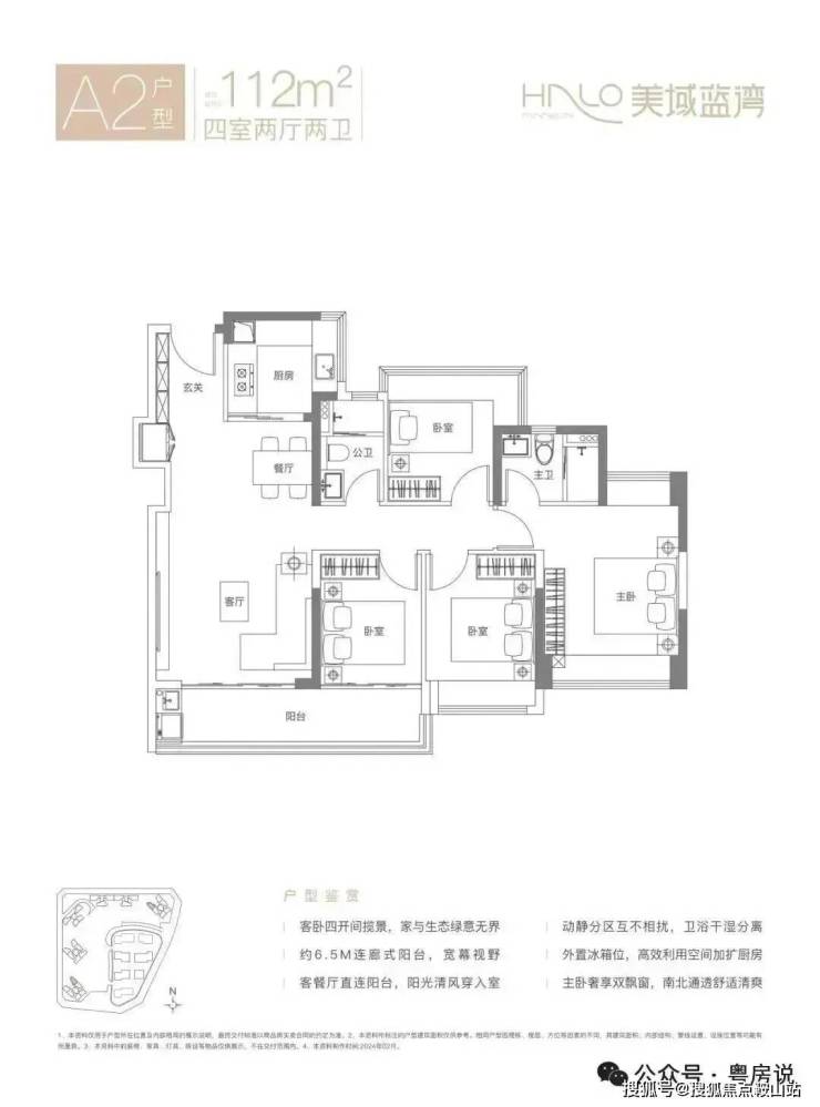 112㎡的4房2厅2卫,A2户型,竖厅南北通透格局,客厅3.9米开间,LDKB一体化设计,S墙设计预留冰箱卡槽位,动静分区,客厅连接次卧出6.5米长的大阳台,U型厨房,卫生间干湿分离,得房率约80.12%(不含赠送),西南或东北朝向。