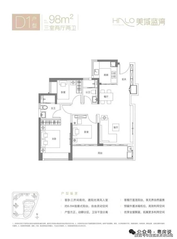 98㎡的3房2厅2卫,D1户型,经典竖厅格局,客厅3.7米开间,LDKB一体化设计,S墙设计预留冰箱卡槽位,动静分区,客厅连接次卧出6.5米长的大阳台,U型厨房,卫生间干湿分离,得房率约80.12%(不含赠送),西南或东北朝向。